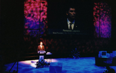 LIVE SOUND NAVIGATORcreation for the WTID, ARENA - Geneva Live Sound Navigator, a world premiere, offered in the Arena throughout the day is a live presentation of the concept of Sound Architectures developped by Dominique Barthassat. Dominique Barthassat opend and closed the WTID's weekend by a performance of Live Sound Navigator and accompanied the proceedings with the Acoustic Design throughout the weekend. The Acoustic Ring, composed of several sound stations, projects the Sound Architecture which creates an effect of a sphere. The huge Sound Architecture thus created projects its sounds into space, making it possible to explore a different dynamic of musical space and invites the spectator to travel in the sensory space of sound, to move within the sound and enable them to perceive another dimension of sound. The composer directs the Acoustic Ring through his computer and 4 keyboards (programmed with composed and sculpted sound matters) in a dialogue with his piano and synthesizer. The musical framework, developed from a palette of composed and sculpted sounds, is shaped by the new computer-related sound technologies. The sound wave created by the Acoustic Ring effect takes different routes and generates new musical forms which are transformed into geometrical shapes. This unfolding of sounds and musical themes constitutes a huge orchestra which allows a new conception of live-composition to establish new ways of listening and new musical techniques which will create new links between creation and technology. The Acoustic Design, during the proceedings, will immerse the spectator in the theme required and will highlight a demonstration, a speaker, etc. |